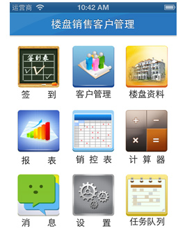 某地產(chǎn)公司iphone端樓盤銷售系統(tǒng),包含:客戶信息管理,樓盤資料展示,樓盤實時銷控,銷售輔助工具等功能。