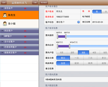 某地產(chǎn)公司ipad端樓盤銷售系統(tǒng),包含:客戶信息管理,樓盤資料展示,樓盤實時銷控,銷售輔助工具等功能。